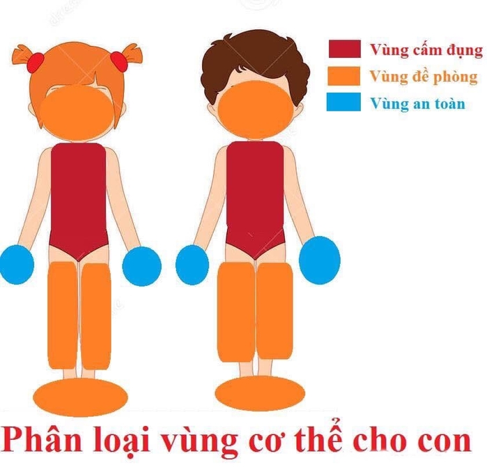 Đó là 4 bộ phận trên cơ thể: Miệng, Ngực, Phần giữa 2 đùi và Mông. Trong đó có "3 Vùng Kín" (hay còn gọi là vùng đồ bơi, vùng đồ lót) là Ngực, Phần giữa 2 đùi và Mông. Mẹ cần dạy bé tuyệt đối không để ai được phép chạm vào những vùng nhạy cảm này.