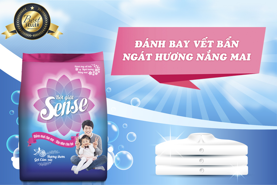 Sense sẽ giúp bạn dễ dàng loại bỏ các vết bẩn 1 cách nhanh nhất, giúp cho quần áo của bạn luôn trắng sạch, thơm mát với hương thơm tinh khiết. Sense khiến cho công việc giặt giũ của người phụ nữ Việt Nam nhẹ nhàng hơn, giúp cuộc sống gia đình thêm yêu thương chia sẻ.Với Sense, bạn sẽ không phải lo lắng quần áo sẽ bị phai màu, hay bị nhàu.Bột giặt Sense với thành phần đặc biệt giúp làm mềm từng sợi vải, ngăn hiện tượng khô cứng cho từng thớ vải. Quần áo sẽ mềm mại hơn sau khi phơi khô và ngay cả khi giặt tay hay giặt máy. Nhờ vậy quần áo khi được giặt với bột giặt Sense sẽ bền hơn các loại bột giặt thông thường.
